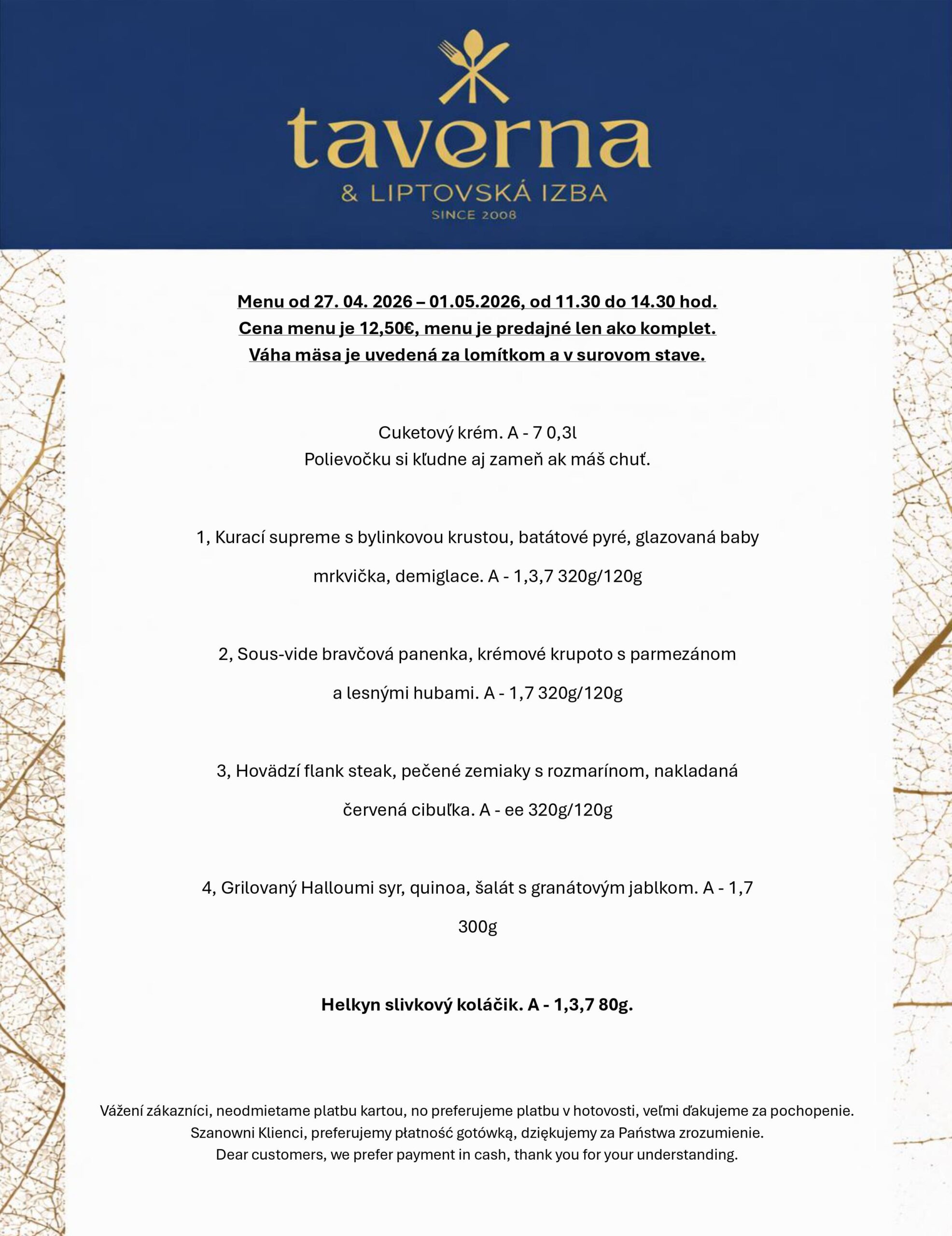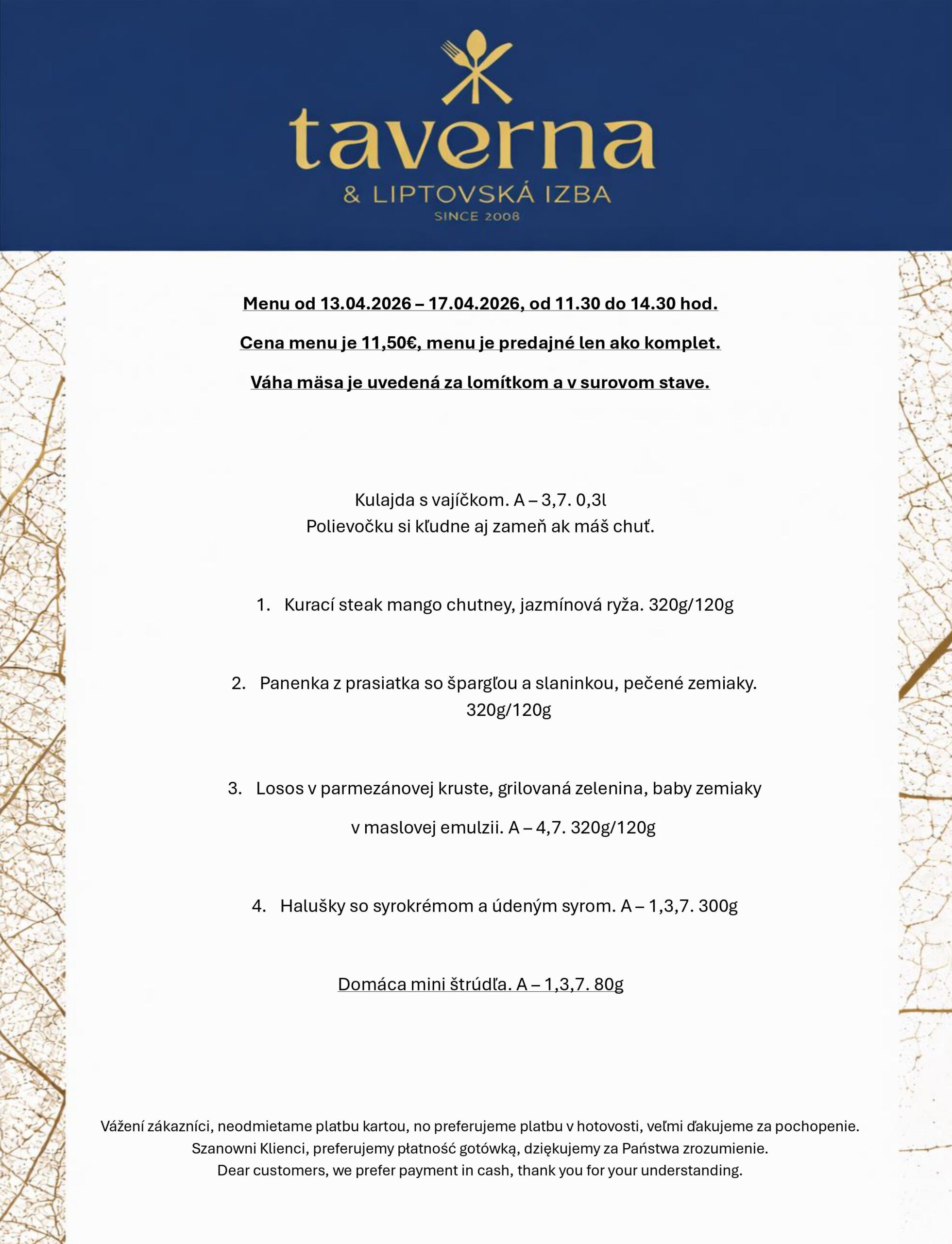 V našej reštaurácii je možné platiť hotovosťou aj platobnou kartou.